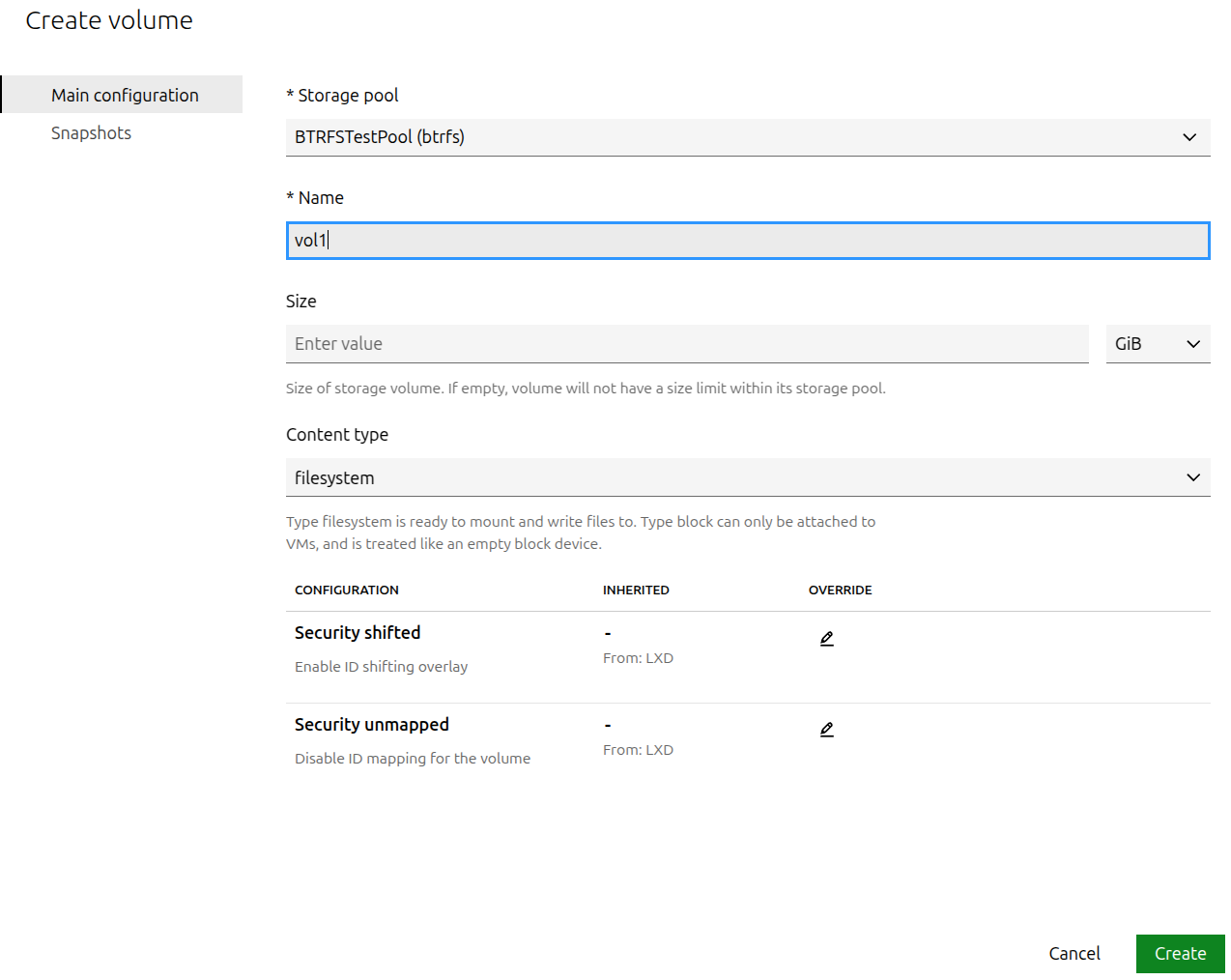 This value is used for all new storage volumes in the pool, unless it is explicitly overridden. In general, the defaults set at the storage pool level can be overridden through a volume’s configuration. For storage volumes of type container or virtual-machine, the pool’s volume configuration can be overridden via the instance configuration.