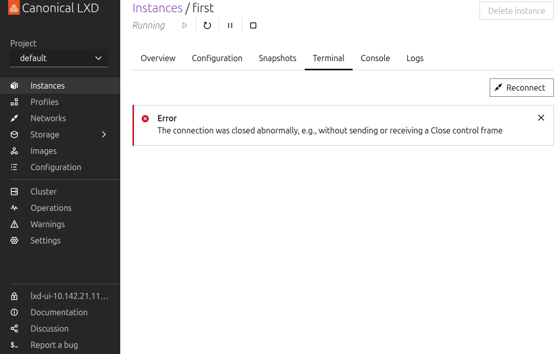 The UI cannot open a terminal for your container anymore, because you deleted the bash command. Luckily, we have a snapshot we can use to restore the container to a previous state.