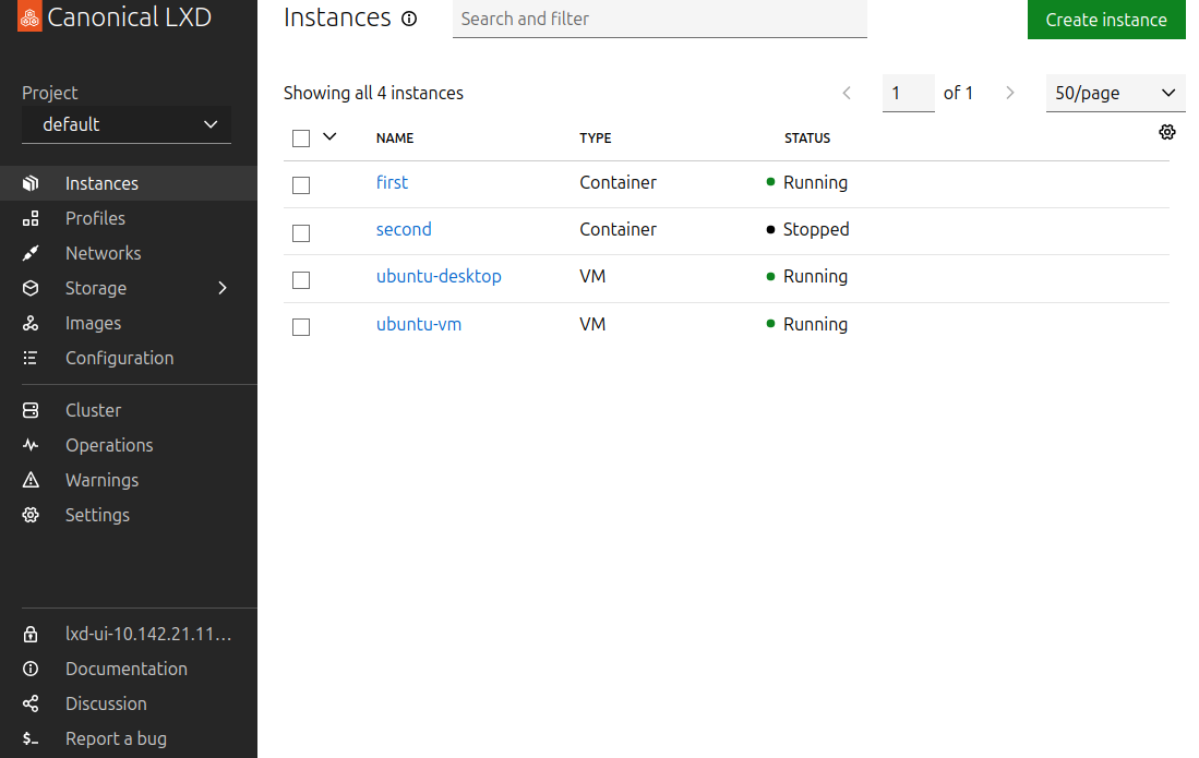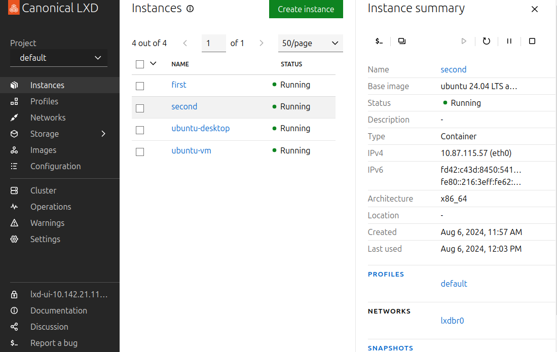 While the installation and initialization steps must be performed via the command line interface, a graphical interface (the LXD UI) is available for use after these setup steps. The LXD UI is accessed through your web browser.